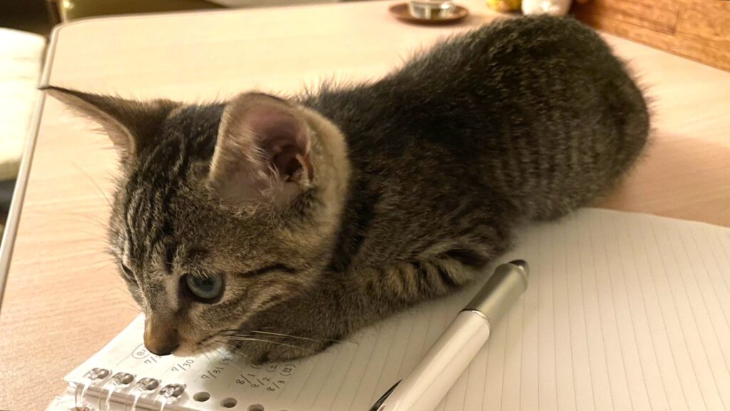 ノートの上に鎮座するにゃんぼう🐈️📝