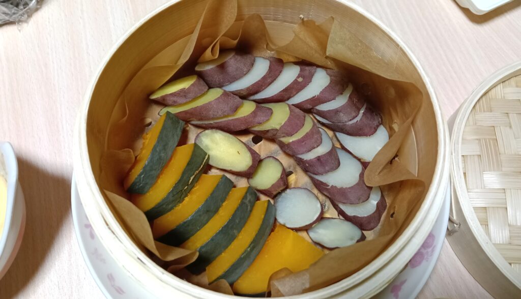 おくさんがせいろで蒸し野菜をつくってくれて、おいしくてうれしかった日(о´∀`о)🍠🎃♨️