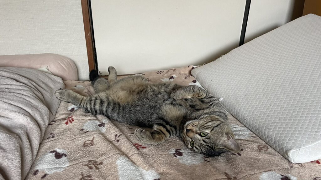 わが家の猫ゆべしが大胆に寝ていますね🐈⬛💕