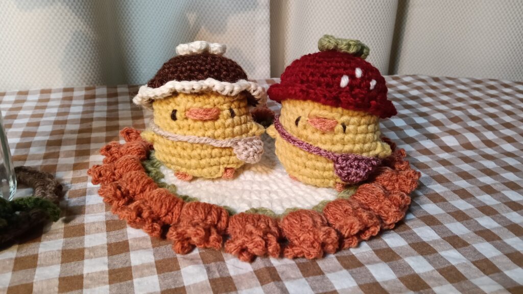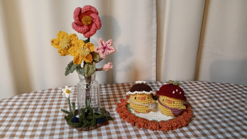 編み物のお花に編みぐるみのひよこたち🐥🧶