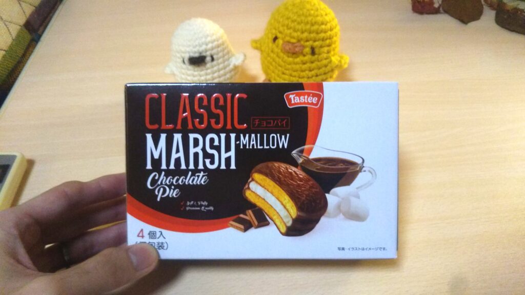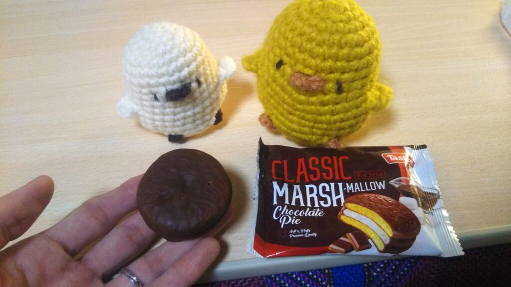 チョコパイより少し小さくて、中はちょっとだけ固めのマシュマロ、