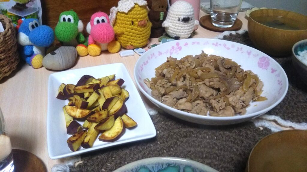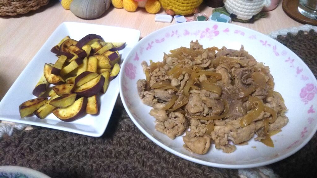 おくさんがつくってくれた“生姜焼き”と“さつまいものバター炒め”がめっちゃうまかった日(*^O^*)🥩🍠💕